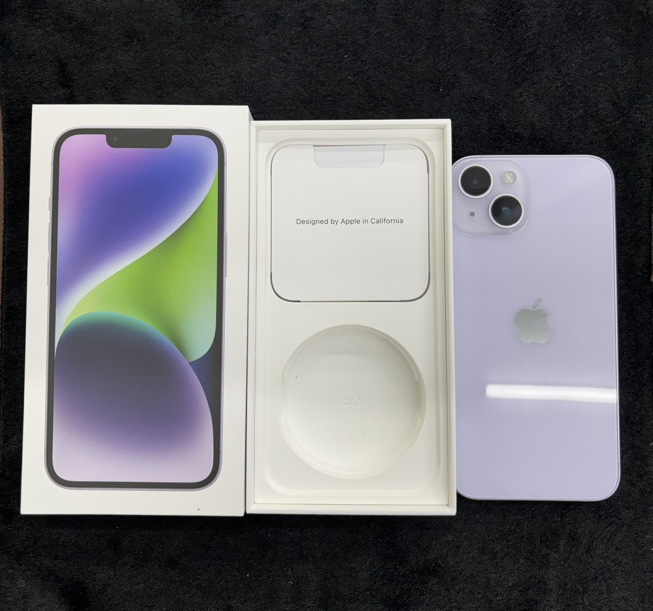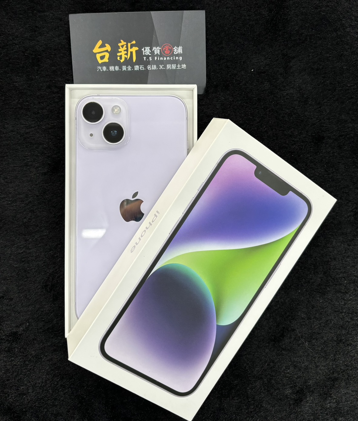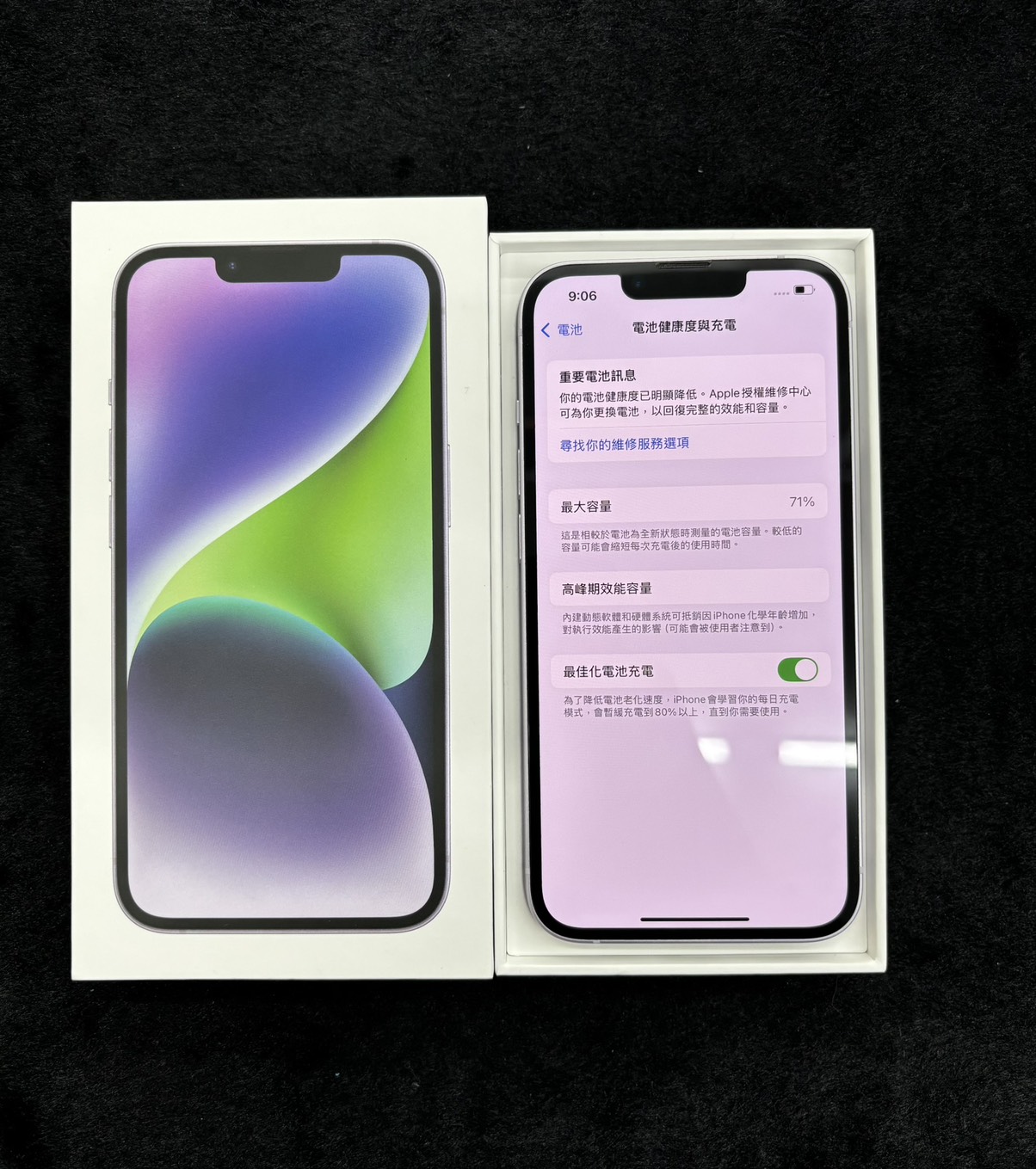 【商品】:I Phone 14 【容量】:128G 【顏色】:淺紫 【電池健康度】:71% 【外觀】:完全無傷,全新 【配件】:盒子 【價格】:8000
